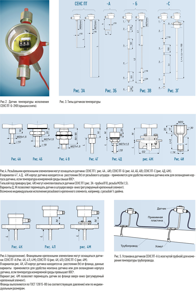 Датчики температуры обозначаются: «СЕНС –1) – 2) – 3) – 4) – 5) – 6)», где: 1) Тип преобразователя: “СЕНС ПТ”, “СЕНС ПТ-А”, “СЕНС ПТ-Б”, “СЕНС ПТ-С”; 2) Материал корпуса: - без обозначения – сталь 09Г2С, - «НЖ» - сталь 12Х18Н10Т; 3) Число кабельных вводов: - без обозначения – один кабельный ввод; - «2КВ» - два кабельных ввода. 4) Тип кабельного ввода - см. раздел “Типы кабельных вводов”; 5) Тип крепежного элемента: варианты показаны на рис. 4. Рекомендации по выбору и примеры обозначения крепежных элементов приведены в руководстве по эксплуатации датчиков (РЭ); 6) Количество и расположение интегральных датчиков температуры: Датчик СЕНС ПТ-А по рис. 3Б имеет один интегральный датчик температуры, размещенный в горизонтальной части трубки (L). Число точек измерения температуры остальных датчиков - по табл. 1.
